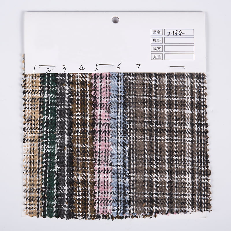 قماش تويد منقوش بخطوط سوداء 2134 هو منتج قماش مصنوع من ألياف كيميائية عالية الجودة بنسبة 100%. يستخدم القماش خطوطًا سوداء كلاسيكية وأنماط مربعات دقيقة كعناصر التصميم الأساسية. ومن خلال تكنولوجيا النسيج المتقدمة، تتكامل الخطوط والأنماط المربعة بشكل مثالي لتشكل تأثيرًا بصريًا فريدًا. لا يعزز هذا التصميم الجمال العام للنسيج فحسب، بل يعزز أيضًا طبقاته البصرية وتعبيره التفصيلي، بحيث يمكن أن يُظهر سحرًا وأسلوبًا فريدًا في إنتاج الملابس المختلفة. من منظور المادة، يستخدم نسيج 2134 أليافًا كيميائية بنسبة 100% ويتمتع بخصائص فيزيائية ممتازة وثبات كيميائي. تشتهر الألياف الكيميائية بقوتها العالية، ومقاومة التآكل، ومقاومة التجاعيد، والمرونة الجيدة، والاحتفاظ بالشكل. هذه الخصائص تمكن نسيج 2134 من الحفاظ على شكل وحجم ثابتين أثناء عملية إنتاج الملابس، وليس من السهل أن يتشوه أو يتجعد. وفي الوقت نفسه، تتمتع الألياف الكيميائية أيضًا بمقاومة جيدة للكهرباء الساكنة والأشعة فوق البنفسجية، والتي يمكن أن تحمي صحة جلد مرتديها إلى حد ما. بالإضافة إلى ذلك، من السهل أيضًا العناية بنسيج 2134. نظرًا لأن الألياف الكيميائية نفسها ليس من السهل امتصاص الماء ولها سطح أملس، فإن هذا القماش سهل التنظيف والصيانة نسبيًا، وليس من السهل أن يبهت أو يتقلص، ويمكنه الحفاظ على مظهره وملمسه الجديد لفترة طويلة.