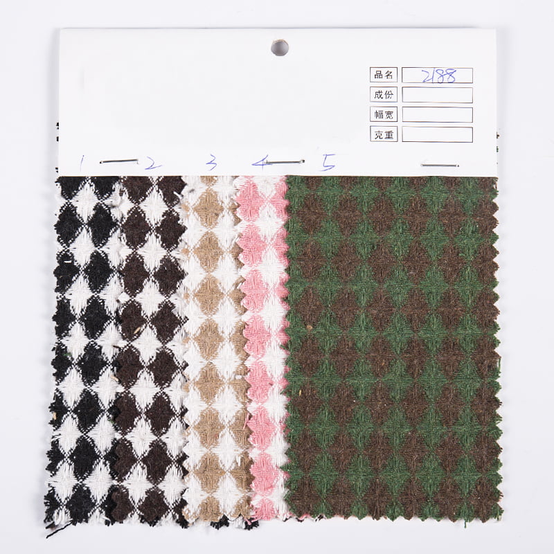 قماش الجاكار المنقوش الماسي 2188 هو نسيج احترافي مصنوع من ألياف كيميائية بنسبة 100%. يستخدم القماش فحص الماس الفريد كعنصر التصميم الأساسي. من خلال تكنولوجيا الجاكار المتقدمة، يتم نسج هذا النمط الكلاسيكي بدقة على سطح القماش. تتم معالجة كل عقدة ماسية بعناية لضمان سلامة النمط ووضوحه، مما يظهر مستوى عالٍ جدًا من الحرفية والتحكم في التفاصيل. فيما يتعلق باختيار المواد، يستخدم نسيج 2188 أليافًا كيميائية عالية الجودة لضمان المتانة ومقاومة التجاعيد وسهولة العناية بالقماش. مع خواصها الفيزيائية والكيميائية المستقرة، فإن الألياف الكيميائية تعطي النسيج ثباتًا جيدًا للأبعاد وليس من السهل أن يتشوه أو يتقلص. وفي الوقت نفسه، تعمل مقاومة التآكل والمقاومة للتمزق للألياف الكيميائية أيضًا على تحسين عمر خدمة النسيج بشكل كبير، بحيث يمكنها الحفاظ على الأداء الممتاز في سيناريوهات التطبيق المختلفة. بالإضافة إلى تكنولوجيا الجاكار الرائعة ومواد الألياف الكيميائية عالية الجودة، يستخدم نسيج 2188 أيضًا تقنية النقش لتعزيز الملمس والتأثير البصري للنسيج. تقوم تقنية النقش بمعالجة خاصة على سطح القماش لجعله يقدم تأثيرًا دقيقًا وطبقات ثلاثية الأبعاد، مما يعزز ملمس القماش وتأثيره البصري. هذا التصميم المنقوش الفريد لا يعزز الجودة الشاملة للنسيج فحسب، بل يجعله أيضًا أكثر جاذبية في مختلف تطبيقات الديكور والملابس.