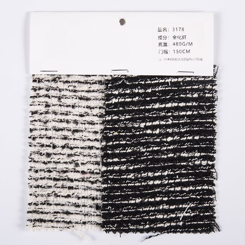 نسيج تويد بوليستر بخطوط أفقية منقوشة 3178 مصنوع من ألياف كيميائية بنسبة 100٪، وخاصة ألياف البوليستر عالية الجودة، مما يضمن المتانة والأداء الممتاز للنسيج. يُعرف البوليستر بمقاومته الممتازة للتجاعيد والتآكل والمرونة الجيدة، مما يجعل نسيج 3178 سهل التعامل مع مختلف التحديات في الارتداء اليومي مع الحفاظ على المظهر الأنيق. سواء تم غسله بشكل متكرر أو ارتداؤه لفترة طويلة، يمكن للنسيج أن يحافظ على شكله وملمسه الأصلي، وليس من السهل أن يتشوه أو يبهت. تعتبر عملية النقش ميزة أخرى لهذا النسيج. من خلال تكنولوجيا النقش المتقدمة، قمنا بتشكيل نمط شريطي أفقي دقيق على سطح القماش. لا تضيف هذه الخطوط إحساسًا بصريًا بالطبقات فحسب، بل تجعل القماش أيضًا ثلاثي الأبعاد وغنيًا باللمس. لا تعمل معالجة النقش على تحسين جمال القماش فحسب، بل تعزز أيضًا متانته ومقاومته للتجاعيد، بحيث يمكنك في كل مرة ترتديه، أن تشعر بالراحة والملمس لمنتج جديد. يمنح تصميم التويد قماش 3178 أسلوبًا فريدًا من المتانة والأناقة. هذا التصميم لا يجعل القماش أكثر امتلاءً وأكثر ملمسًا بصريًا فحسب، بل يوفر أيضًا أداءً ممتازًا للاحتفاظ بالدفء. سواء كان الشتاء البارد أو فصلي الربيع والخريف الباردين، فإن هذا القماش يمكن أن يمنحك الدفء والراحة.
