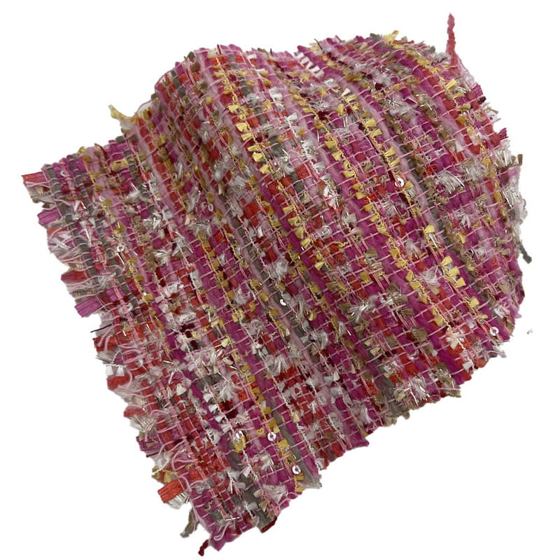 هذا القماش، المصنف بالمادة 21003، هو نسيج تويد يتكون من 67% بوليستر و33% أكريليك. مع كتلة لكل وحدة مساحة تبلغ 385 جرامًا للمتر المربع، فهي تقدم بنية متوسطة الوزن. يشتمل القماش على الترتر الأحمر والوردي مع خيوط معدنية، يتم دمجها أثناء عملية النسيج لإنشاء سطح عاكس مشتت. توفر قاعدة البوليستر الثبات الهيكلي، بينما يساهم مكون الأكريليك في ارتفاع النسيج وملمسه. وينتج عن هذا المزيج مادة ذات انعكاس الضوء المتنوع وأبعاد السطح. هذه الخصائص التقنية تجعل هذا التويد قابلاً للتطبيق على الملابس النسائية التي تتطلب عناصر زخرفية وسلامة هيكلية.