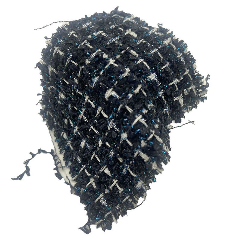 هذا القماش، المصنف بالمادة 23511، هو نسيج تويد مربع يتكون من 86% بوليستر و14% نايلون. مع كتلة لكل وحدة مساحة تبلغ 340 جرامًا للمتر المربع، فهي تقدم بنية خفيفة الوزن. تشتمل القاعدة الزرقاء الداكنة على خيط معدني أزرق داخل نمط المربعات، مما يخلق تأثيرًا بصريًا متباينًا من خلال انعكاس الضوء المتنوع. يوفر مزيج البوليستر والنايلون ثبات الأبعاد والاتساق الهيكلي. يضيف إدراج العناصر المعدنية خصائص تفاعلية خفيفة إلى السطح المنسوج. هذه المواصفات الفنية تجعل نسيج التويد هذا قابلاً للتطبيق على الملابس النسائية حيث يتطلب الأمر توضيحًا محددًا للنمط وتنوعًا دقيقًا في السطح.
