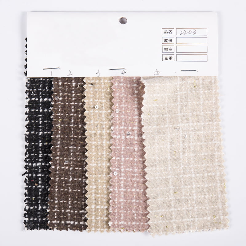 قماش التويد المنقوش بالترتر 2203 هو منتج قماش مصنوع من ألياف كيميائية عالية الجودة بنسبة 100٪. من خلال تكنولوجيا النسيج المتقدمة، يجمع هذا النسيج بشكل مثالي بين المتانة ومقاومة التجاعيد وخصائص العناية السهلة للألياف الكيميائية، مما يضمن أن القماش يمكن أن يحافظ على شكله وملمسه الأصليين بعد الاستخدام طويل الأمد والغسيل المتكرر. الميزة الأساسية للنسيج تكمن في تصميمه الفريد والمطرز بالترتر. يتم توزيع عناصر الترتر بالتساوي على سطح القماش من خلال عملية ترصيع دقيقة، والتي لا تعزز الطبقات المرئية للنسيج فحسب، بل تظهر أيضًا تأثيرًا رقيقًا ومنخفض اللمعان تحت الضوء، مما يضيف تسليط الضوء الفريد على ملابس. يعتمد النمط المربعات على مطابقة الألوان والتصميم الكلاسيكي، والذي لا يحتفظ فقط بالسحر القديم لنسيج التويد، ولكنه يتضمن أيضًا بساطة وأجواء التصميم الحديث، بحيث يمكن للنسيج أن يظهر مظهرًا أنيقًا وعصريًا في مجموعة متنوعة من المناسبات. من حيث الملمس، يمنح قماش التويد المربعات 2203، مع عملية نسج التويد، النسيج إحساسًا غنيًا ثلاثي الأبعاد ولمسة رقيقة. إن اختيار الألياف الكيميائية يجعل القماش ناعمًا ومريحًا مع وجود تهوية جيدة ومقاومة للتآكل، مما يضمن أن يشعر مرتديها بالراحة أثناء الاستمتاع بجمال الموضة. يتميز قماش التويد المزخرف بالترتر 2203 أيضًا بمرونة عالية للغاية وقابلية للتطبيق. سواء تم استخدامه للأزياء المخصصة الراقية أو الإكسسوارات للارتداء اليومي، يمكن للنسيج أن يدمج بشكل مثالي أنماط التصميم المختلفة ومتطلبات الخياطة، مما يُظهر سحر الموضة المختلفة.